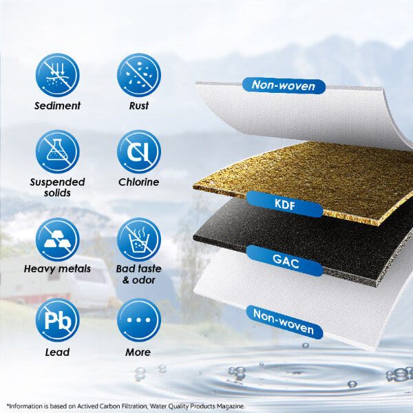 - [Superior Performance] Certified by NSF against NSF/ANSI 42 and 372 Standard, Waterdrop inline water filter for RV has highly efficient multi-stage filtration with the use of KDF and GAC technology. Delivers cleaner and safer drinking water by reducing Chlorine, Bad Taste &Odor and other large particles.