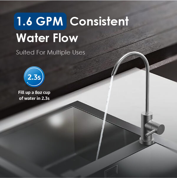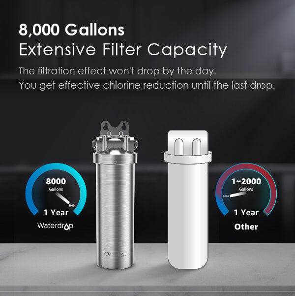 - The stainless steel under counter water filter provides up to 8,000 gallons of high-quality filtered water or 12-24 months of performance, which may vary according to local water quality.