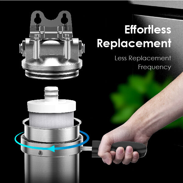 - If the under counter water purifier needs to be replaced, just twist off the housing, remove the expired filter and install a new one, which takes no more than 30 seconds.