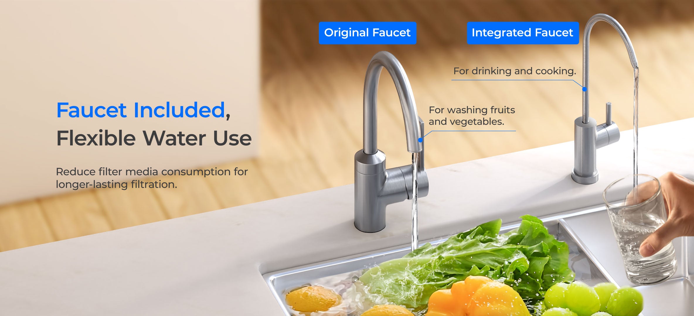 Flexible Use: Separate faucet for drinking/cooking, original faucet for washing.
