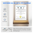 - [NSF/ANSI 42, 53, 401 & 372 Certified]The Mega electric water filter pitcher has been certified by IAPMO against NSF/ANSI 42, 53, 401 & 372 standards to reduce 30+ substances including chlorine, lead, mercury, benzene, bisphenol A and more. It also has been tested by a third-party lab to reduce PFOA, PFOS, ensuring high-quality drinking water.
