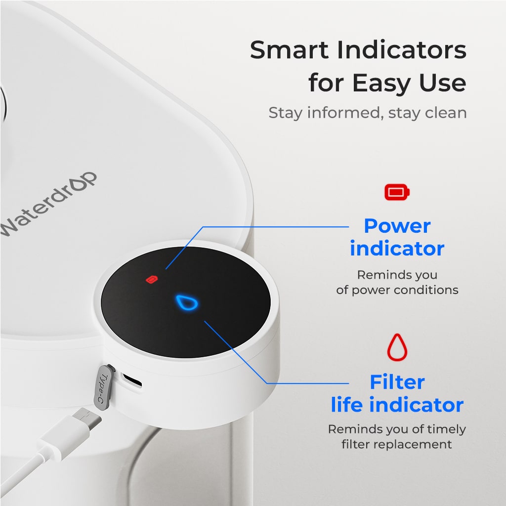 • Clear Indicators for Easy Operation:The electric water dispenser features clear indicator lights for effortless use. The power indicator flashes red when it's time to recharge, while the filter life indicator flashes red when the filter needs replacing soon and stays red when a replacement is urgent. Enjoy hassle-free maintenance with these intuitive alerts.