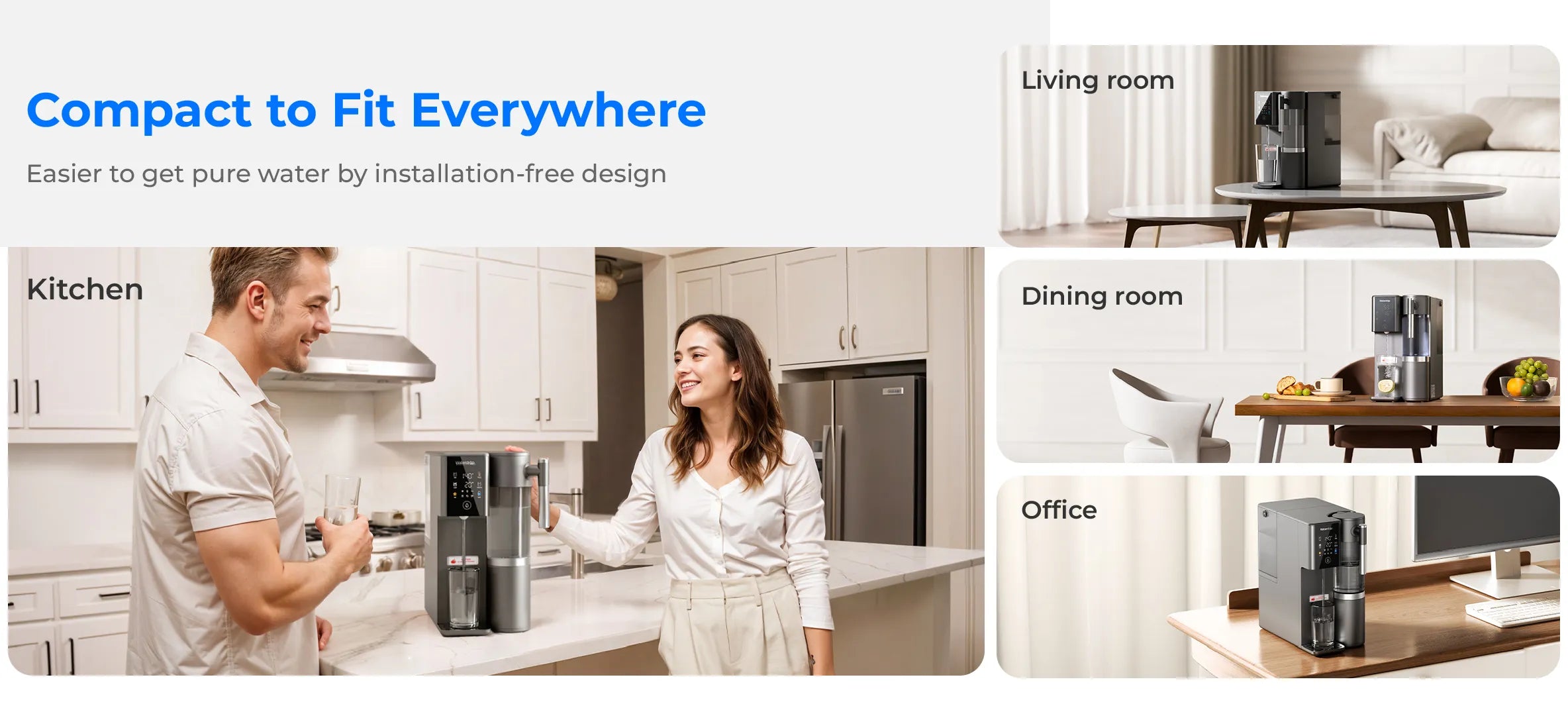 Easier to get pure water by installation-free design, from the kitchen, and living room to the office, or even RVs.