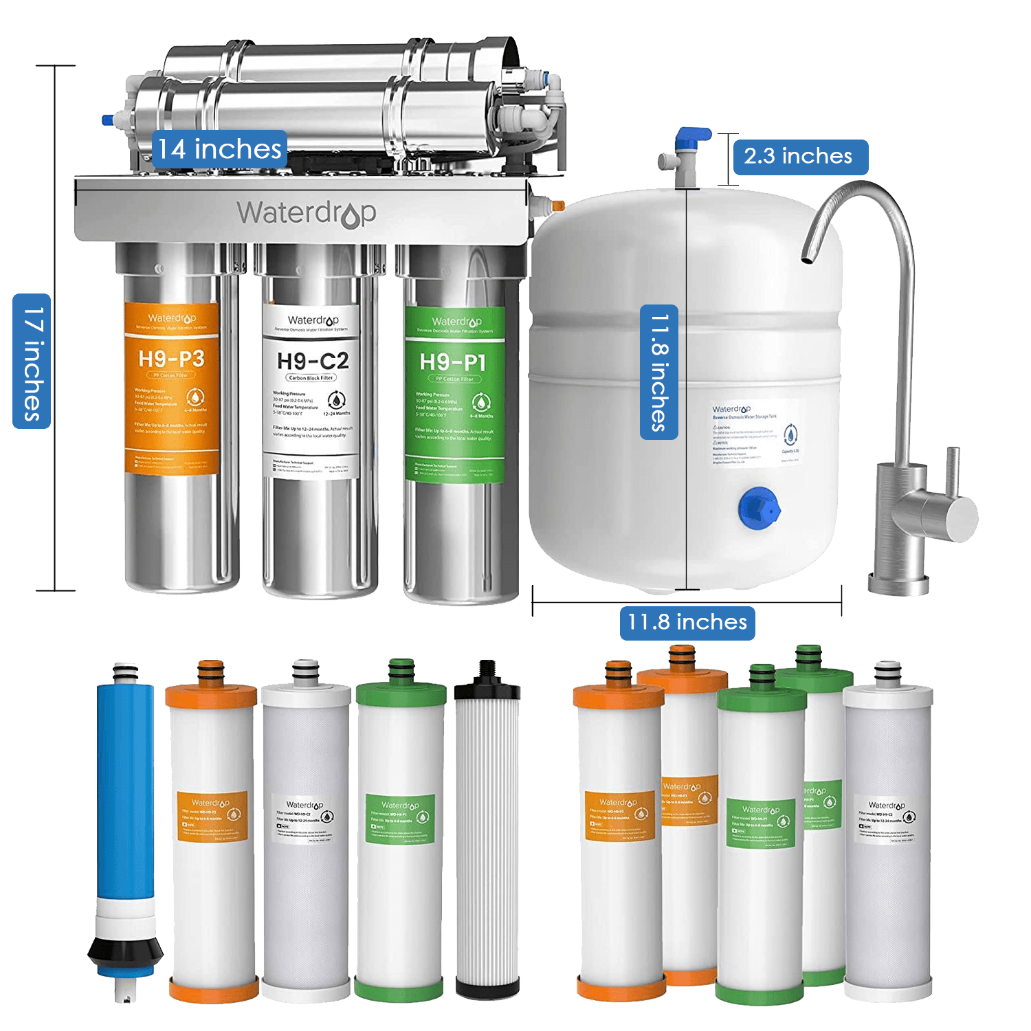 - [Eliminate impurities larger than 0.0001 μm] This system’s high density filtration membrane can eliminate all impurities larger than 0.0001 micron, including chlorine, heavy metals and TDS. Waterdrop RO system restores water to its essence by reducing the funny taste and odor.